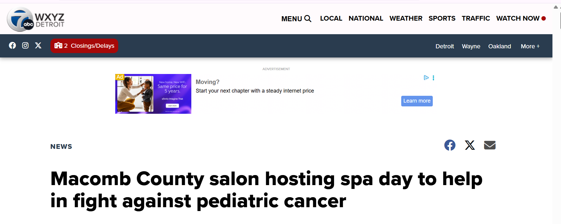 Roseni Salon was honored to be featured on WXYZ Channel 7 for hosting a community spa day supporting the fight against pediatric cancer. We are proud to serve Washington Township and Macomb County not only through beauty services, but through giving back.